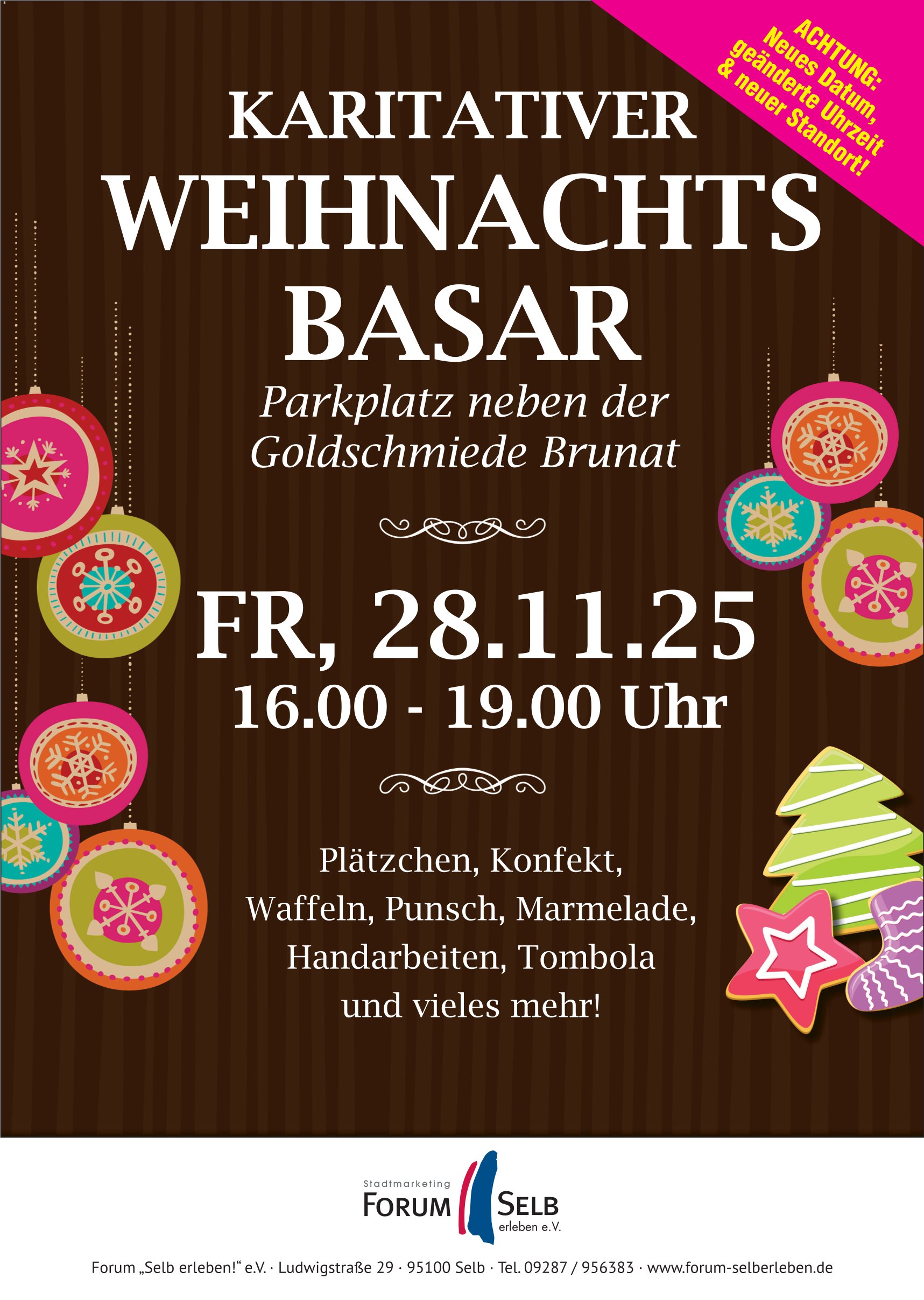 Am Eröffnungstag des Weihnachtsmarktes, am Freitag, den 28.11.2025 findet von 16:00 – 19:00 Uhr der karitative Basar statt, zum zweiten Mal auf dem Parkplatz neben der Goldschmiede Brunat. Dort werden allerlei selbstgemachte Sachen wie z.B. Plätzchen, Rote Grütze, Eierlikör oder Sterne, Lavendelsäckchen und Weihnachtskarten, aber auch Glühwein, Punsch, Waffeln oder andere Mehlspeisen verkauft. Weiterhin gibt es ein Glücksrad und eine Tombola.